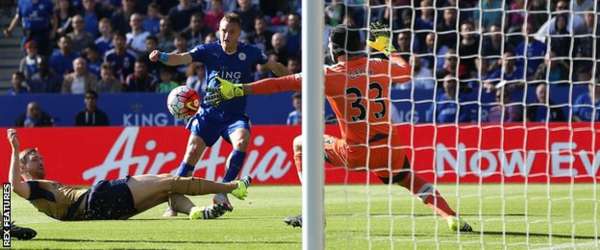 Former Leicester defender Matt Elliott: "Oh my word! The whole stadium is up on its feet, myself included! It was an inch-perfect ball in behind the United defence, and Jamie Vardy was onto it in a flash. What a finish, what quality!"