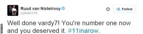 Jamie Vardy broke Ruud van Nistelrooy's record as he became the first player to score in 11 consecutive Premier League matches.